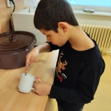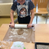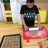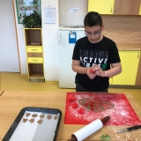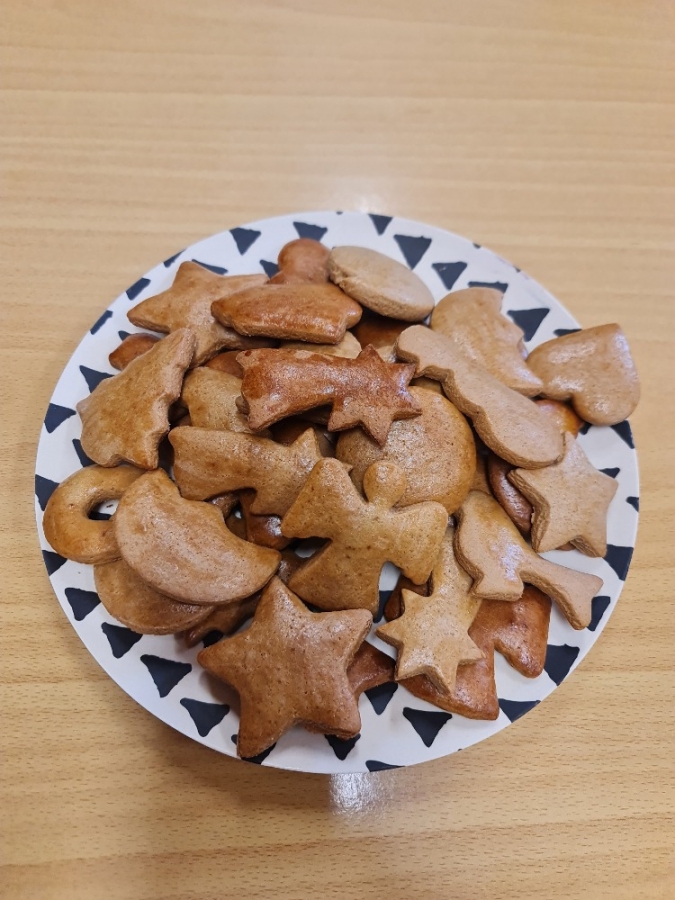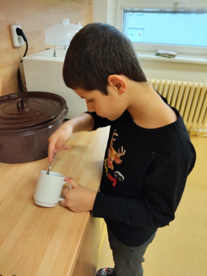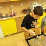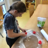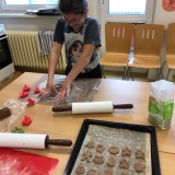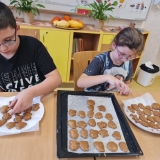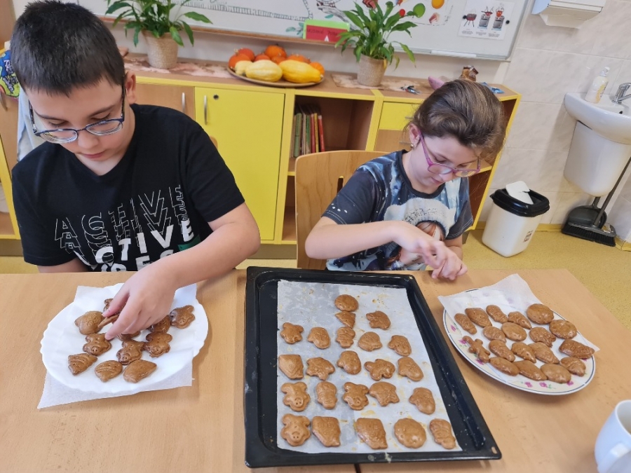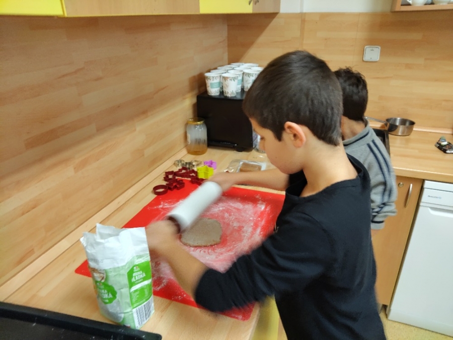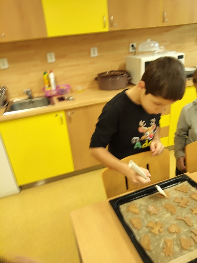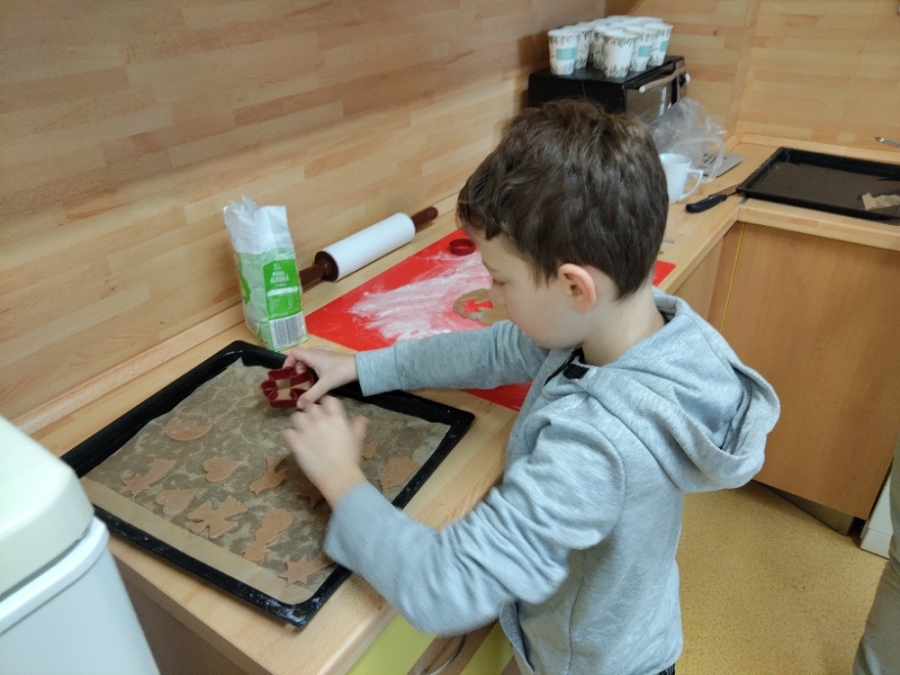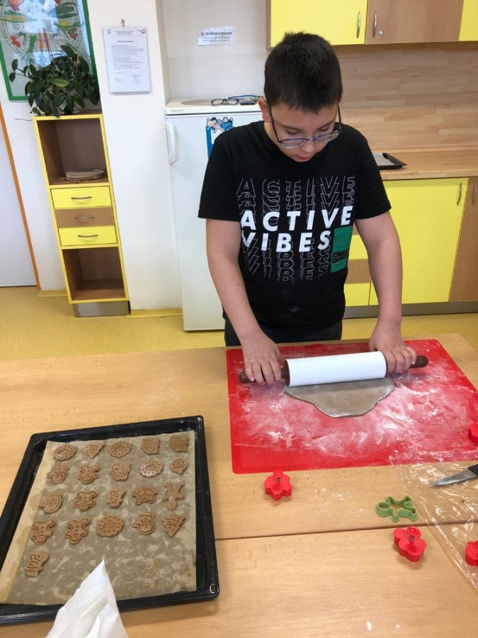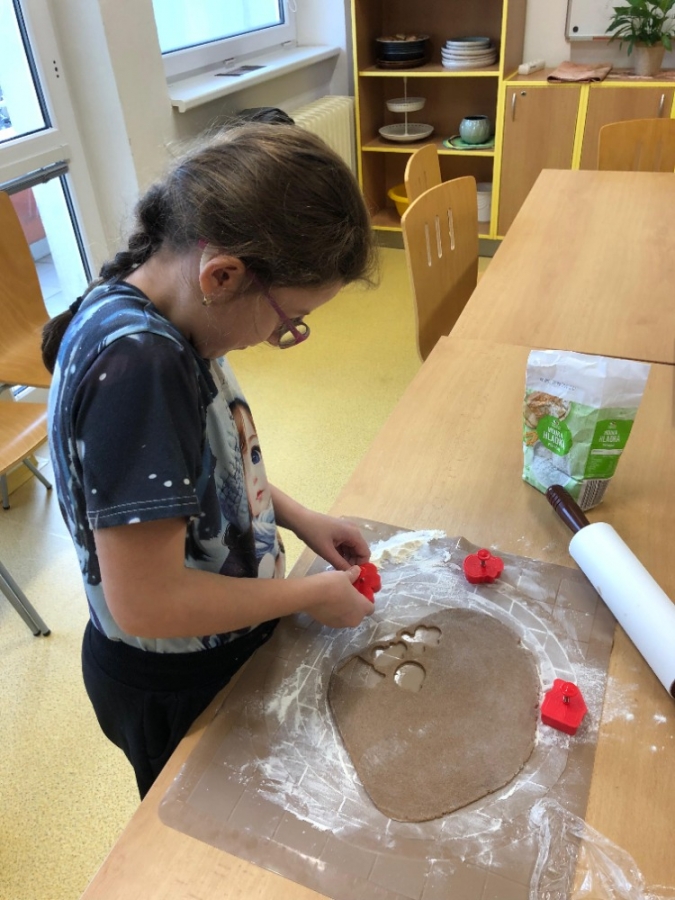 Dnes jsme se s žáky 4. třídy a ZŠS V. zapojili do pečení perníčků ve školní kuchyňce. Pro žáky bylo připravené perníkové těsto, se kterým dále samostatně nebo s dopomocí pracovali. Nejprve si žáci připravili pracovní plochu, těsto rozváleli a pomocí vykrajovátek vykrajovali různé tvary perníčků. Někteří žáci potřebovali při práci vedení, jiní zvládali jednotlivé kroky samostatně. Hotové perníčky žáci ukládali na plech vyložený pečicím papírem. Společně jsme perníčky vložili do trouby a po upečení je nechali vychladnout. Aktivita rozvíjela jemnou motoriku, samostatnost, spolupráci a dodržování pracovního postupu. Pečení probíhalo v příjemné a klidné atmosféře a žáci měli z výsledku své práce radost.