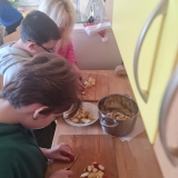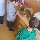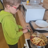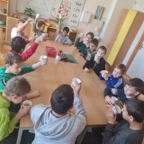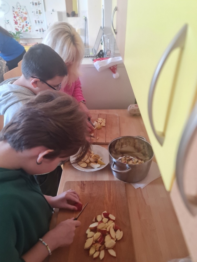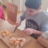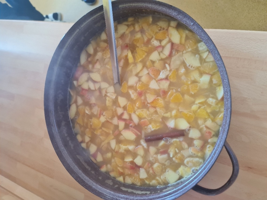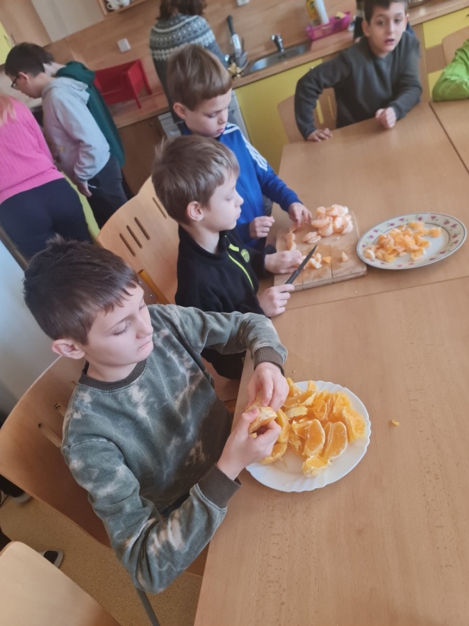 Dnes proběhla se žáky 1. stupně naší školy příprava vánočního punče. Aktivita byla zaměřena na společnou práci, vánoční atmosféru a rozvoj praktických dovedností. Potřebné ingredience jsme získali v rámci projektu Ovoce do škol. Ve školní kuchyňce jsme si nejprve připravili veškeré ovoce, které jsme obdrželi. K dispozici jsme měli pomeranče, jablka, hrušky, mandarinky, citrony a jablečné džusy. Žáci se postupně zapojili do práce a pod dohledem dospělých ovoce krájeli. Při práci dbali na bezpečnost a vzájemnou spolupráci. Nakrájené ovoce jsme vložili do nádoby a dali ohřívat. Za občasného míchání jsme přidali perníkové koření a celou skořici. Kuchyňkou se brzy rozvoněla příjemná vánoční vůně. Hotový punč jsme žákům nalévali do kelímků. Děti měly radost, že mohly ochutnat nápoj, na jehož přípravě se samy podílely. Během čekání na punč si žáci vybarvovali předem připravené vánoční omalovánky. Celá aktivita probíhala v klidné a přátelské atmosféře. Společná příprava vánočního punče byla pro žáky příjemným zpestřením adventního času.