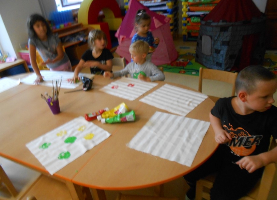 V těchto dnech jsme se věnovali tématu „Koulelo se, koulelo červené jablíčko“, a tak i činnost v polytechnické výchově byla zaměřená na toto téma. Zkrátka a dobře jsme si vytvořili ubrousky s obtisky jablíček. Postup práce: Na rozkrojená jablíčka jsme nanášeli temperové barvy a tvořili obtisky různých barev na bavlněnou látku, kterou jsme také barevně olemovali. Vznikly různorodé, barevné ubrousky. A opravdu nejde říct, který je ten nejhezčí. Prostě všechny ubrousky jsou originál!
