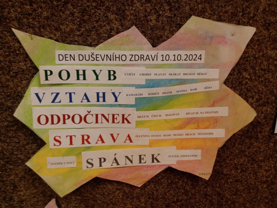 V návaznosti na Světový den duševního zdraví, který připadá na 10. října, proběhl na naší škole ve dnech 7. – 11. října 2024 projekt Týden duševního zdraví, abychom dětem připomněli, že zde na své problémy a starosti nejsou sami. Aby si uvědomily, že každý z nich má své zdroje, zábavy a činnosti, kterými se mohou snadno povzbudit ve chvílích, kdy jim není dobře na duši, a že kolem sebe také mají lidi, na které se mohou spolehnout a kteří je mají rádi.