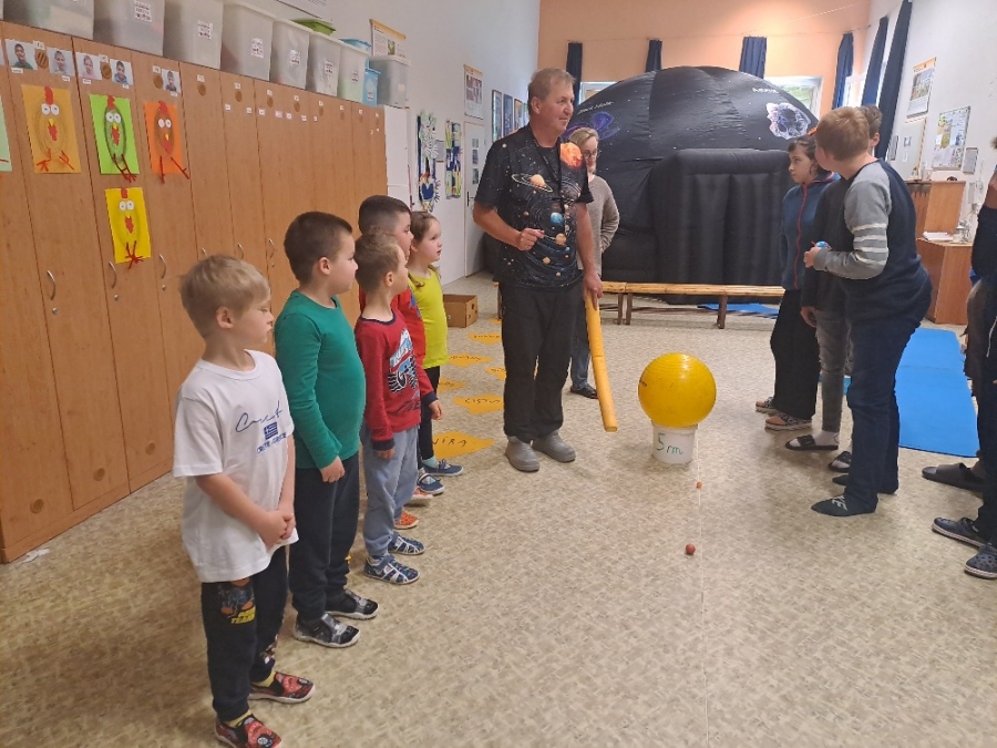 Na konci května se děti společně se školáky zúčastnily zážitkového vzdělávacího programu na téma Vesmír. Děti se v mobilním vesmírném stanu zhlédnutím videoprojekce dozvěděly spoustu informací o Sluneční soustavě – např. proč Slunce na obloze svítí, kdy ho vidíme a kdy ne, jak můžeme vidět Měsíc, jak se otáčí Země, kdy vidíme na obloze hvězdy nebo jak se nazývají jednotlivé planety. Ve druhé části – tzv. „Živém Vesmíru“ si děti zkoušely hravou formou prakticky napodobovat pohyb Země nebo Měsíce kolem Slunce. Dětem se tato nevšední akce moc líbila a za pozornost si odnesly malou odměnu v podobě omalovánky.