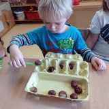 Dnes ve všech třídách probíhala činnost zaměřená na environmentální výchovu. Užili jsme si dopoledne plné her a tvoření s přírodninami. Zasoutěžili jsme si s kaštany (doplňovačka, počítání, seřazování apod.), ale také jsme vytvořili hlemýždě s „domečky“ z kaštanů a „kaštanové cestičky.“ Také se nám podařilo vytvořit pomocí bramborových razítek les plný hříbků…