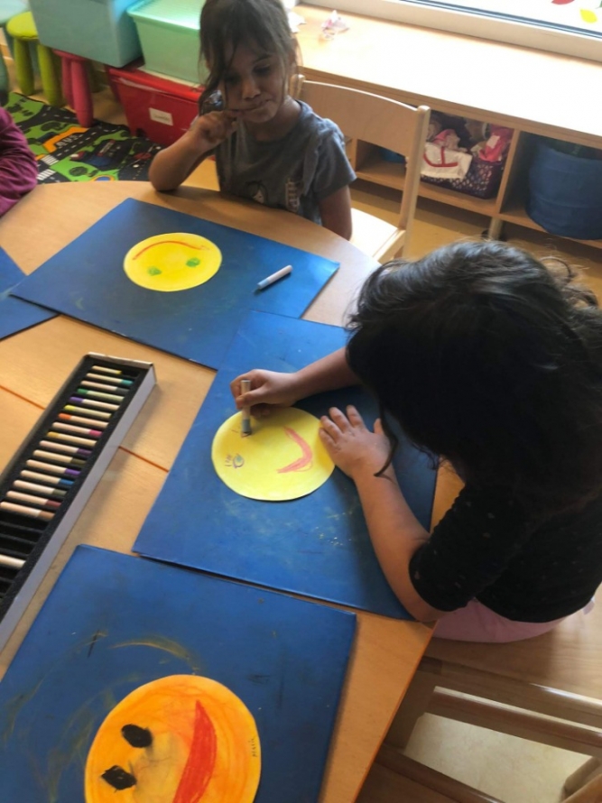 S dětmi jsme si pak ve třídách povídali o svých pocitech, o tom, kdy se objeví na naší tváři úsměv, kdy máme radost, kdy je nám veselo. Přečetli jsme si pohádku „O úsměvu“. Prohlíželi jsme si smajlíky, poznávali jejich výraz tváře, jejich pocity. Na videu jsme si pustili veselý smích malých dětí, i dospělých, koukali se na tváře zvířátek, která se usmívají. Také jsme si každý vyrobili svého smajlíka a dali si záležet na tom, ať se nám podaří namalovat jeho úsměv. A můžete se kouknout i na společnou fotku dětí z Berušky a jejich smajlíků.