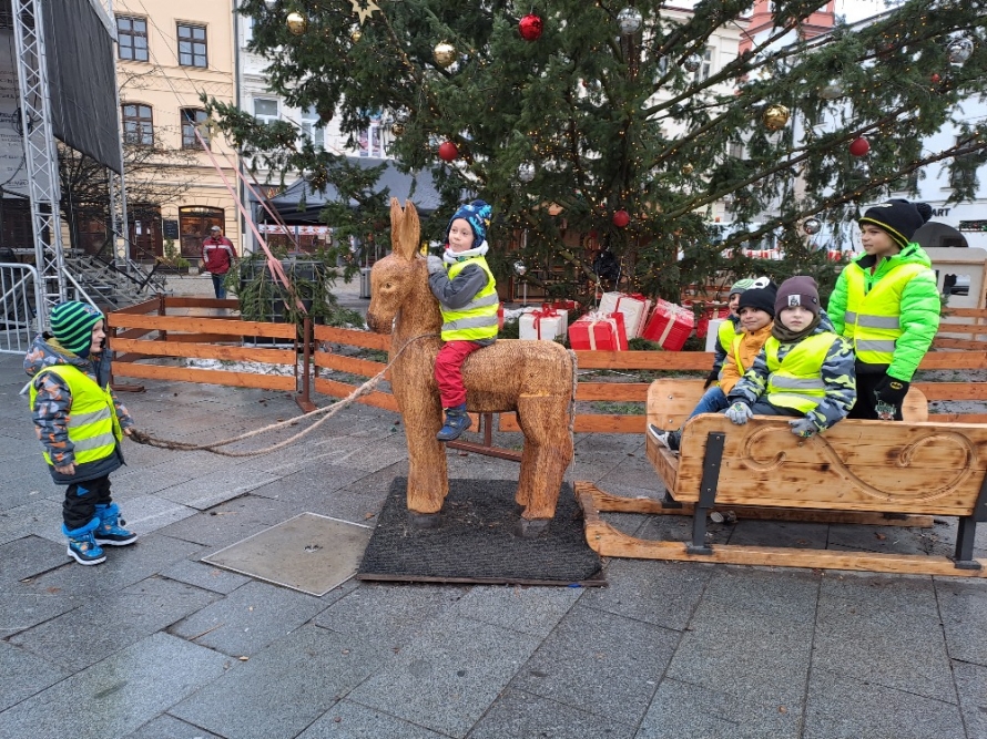 Vánoční atmosféra je všude kolem nás. Byli jsme se také podívat na náměstí, které je v těchto dnech kouzelné. Obrovský vánoční stromeček, dřevěný Betlém, stánky plné vůní, kolotoč, dřevěné sáně s oslíkem, ale také živé ovečky, koza, oslík, lama… kapříci v kádi… Odcházeli jsme plní dojmů.