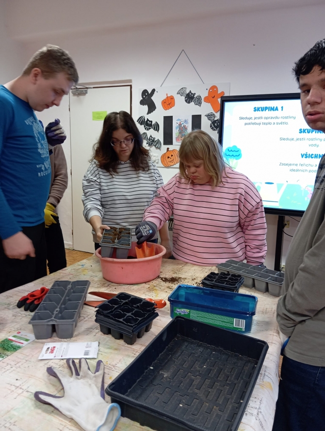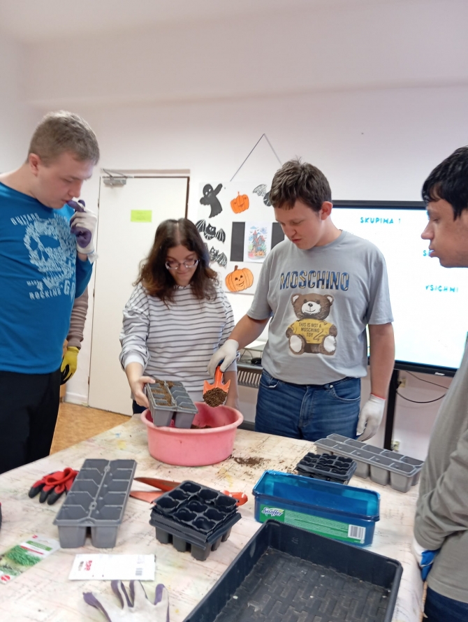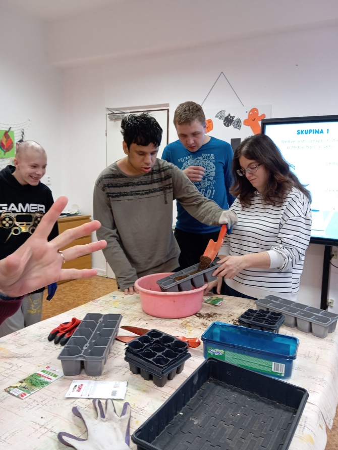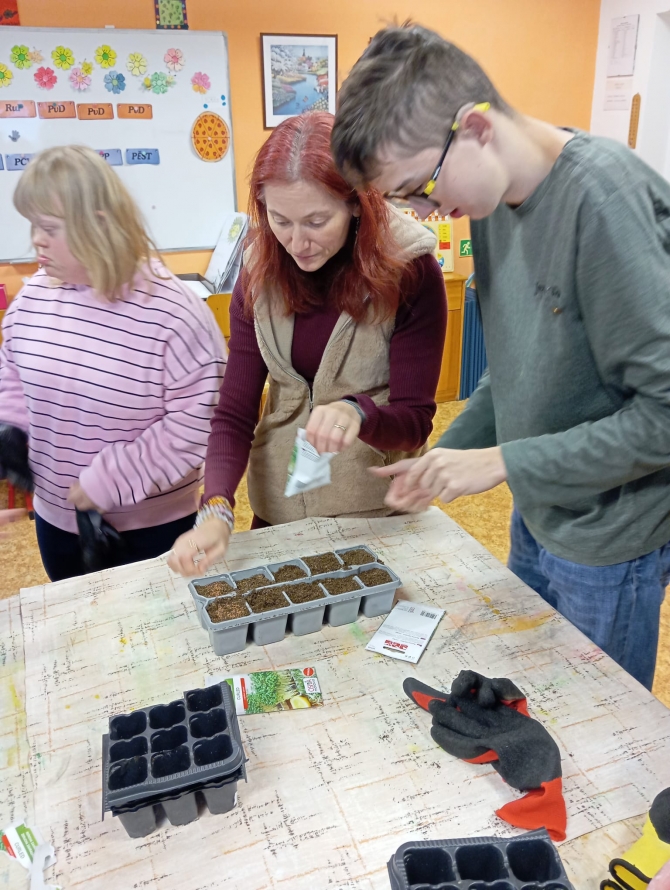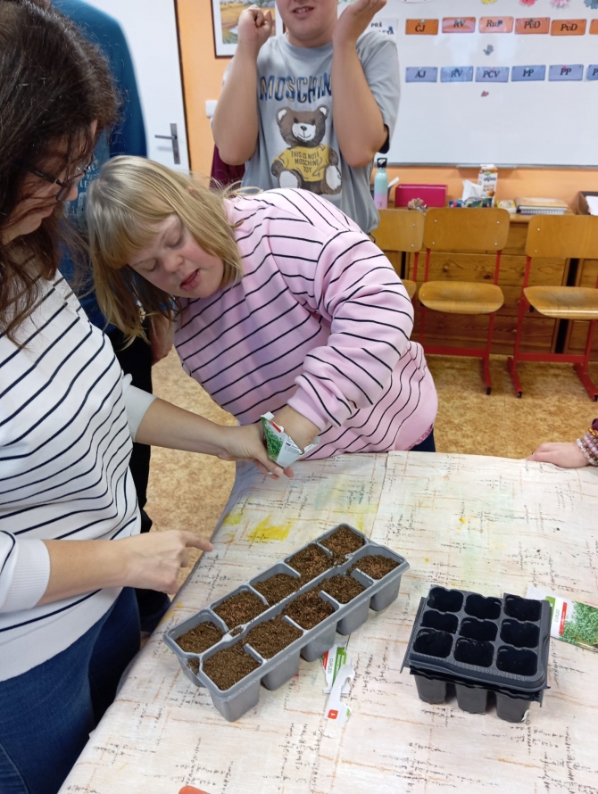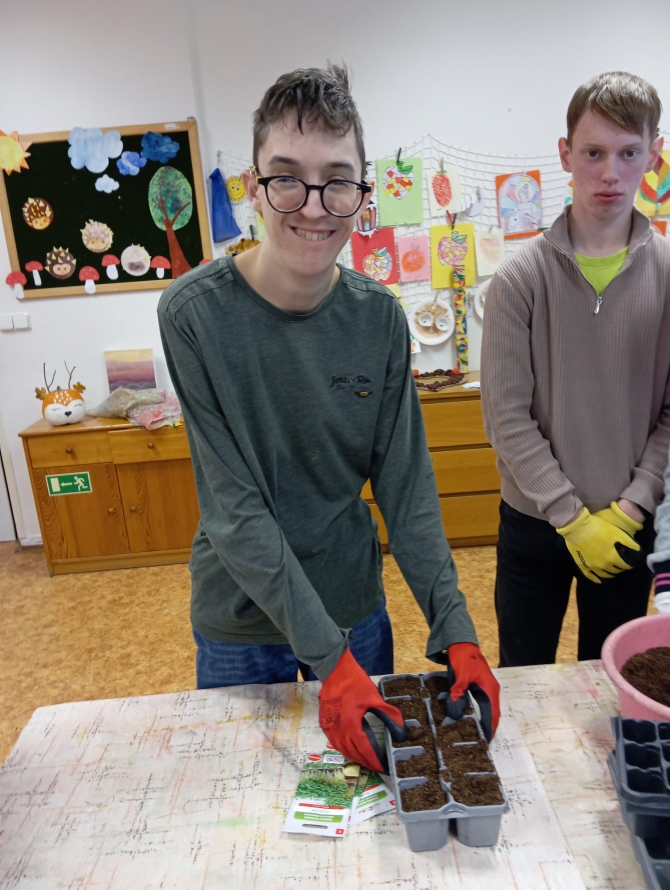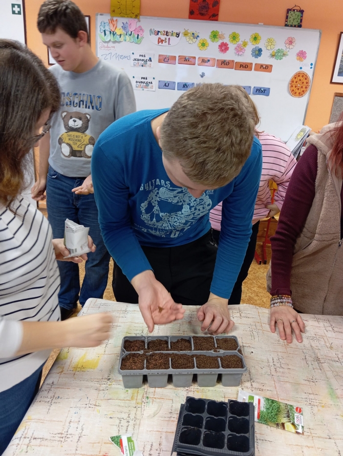 Dne 21.11. 2025 se žáci Prš I a Prš I+II spojili a pracovali společně na projektu z pěstitelství. Celý listopad nás v tomto předmětu provází témata týkající se životních požadavků rostlin. Rozhodli jsme se proto probíranou teorii ověřit v praxi a provést takový menší pokus. Žáci pracovali ve 3 skupinkách a pod dohledem pedagogických pracovníků. Jejich úkolem bylo vysévat semínka řeřichy a u zasetých rostlinek sledovat vliv tepla, světla, dostatku či nedostatku vody a vzduchu. Jsme velmi zvědaví, jak se bude rostlinám dařit a za pár týdnů pokus s žáky vyhodnotíme. Řeřichu poté budou moci žáci ochutnat během přípravy pokrmů. Žákům se projektová hodina líbila a byli rádi, že na ní pracovaly obě třídy společně.