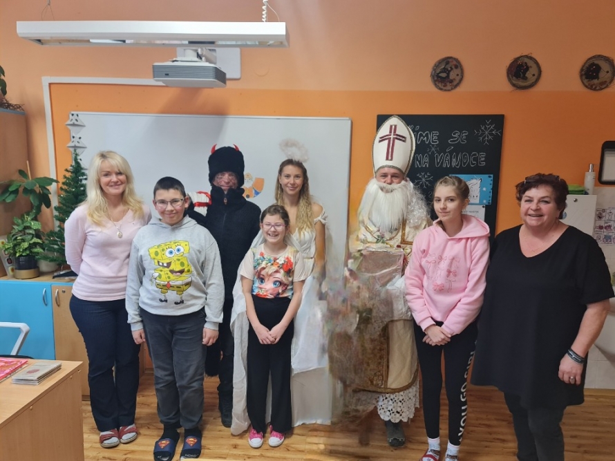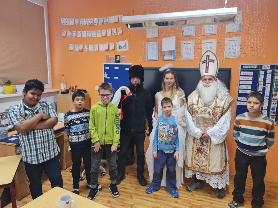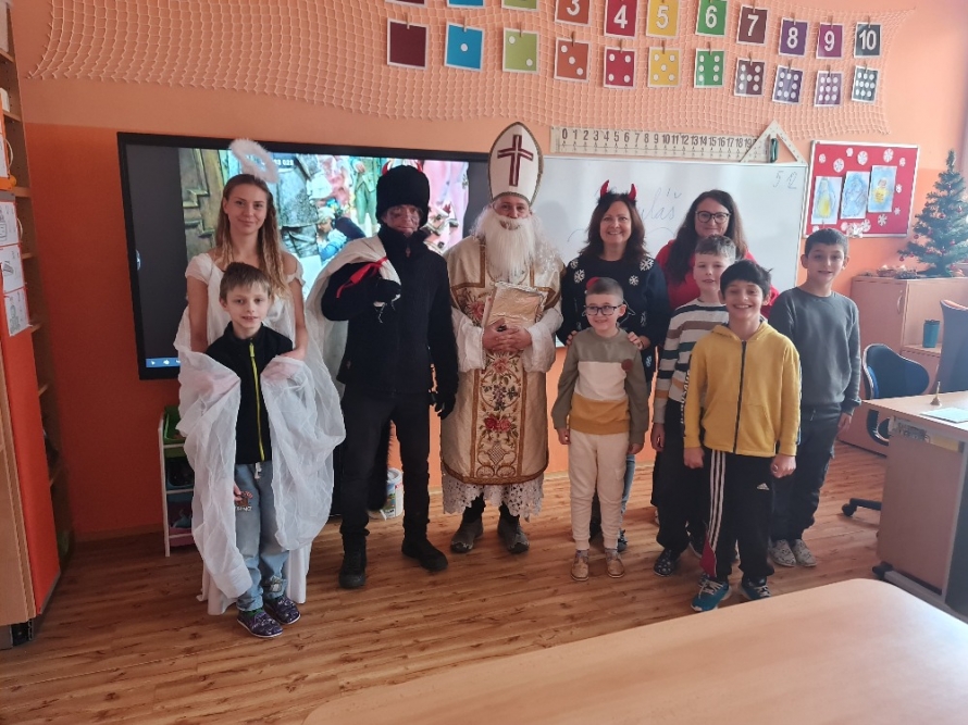 Dnes 5. 12. 2025 nás navštívili Mikuláš, čert a anděl, kteří procházeli jednotlivé Třídy 1. stupně. Anděl žáčky mile přivítal a pochválil je za jejich práci i chování. Čert byl naopak přísnější a naznačoval, že by si některé žáky rád odnesl do pekla. To mezi žáky vyvolalo napětí i očekávání. Nakonec však vše dobře dopadlo a čert si nikoho neodnesl. Žáci přednesli vánoční básničky nebo zpívali zimní písně. Snažili se předvést co nejlepší výkon. Mikuláš je pozorně poslouchal, anděl chválil a čert nakonec uznal, že děti byly šikovné. Celá návštěva skončila velkou pochvalou pro všechny žáky.