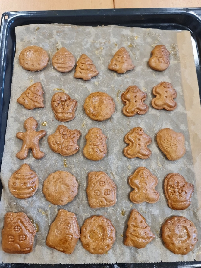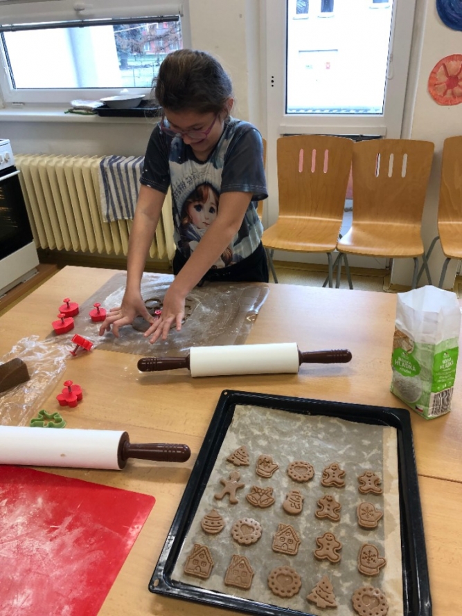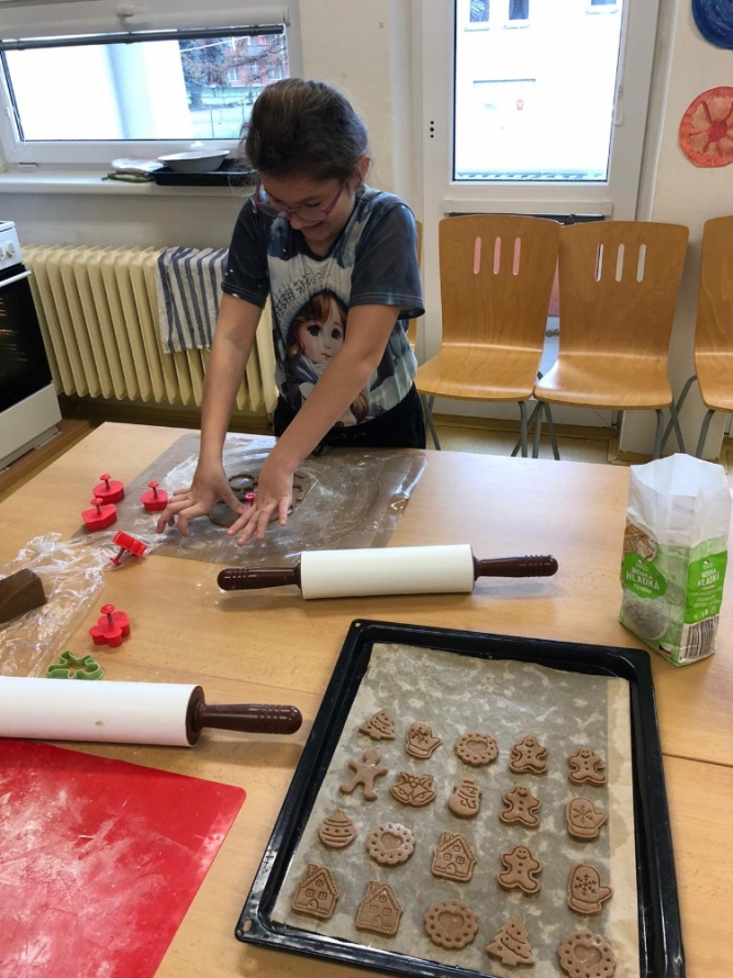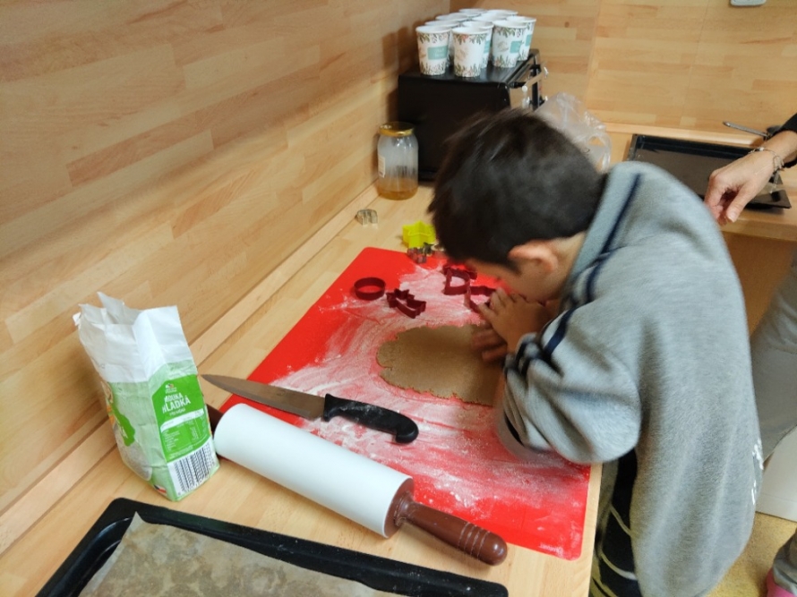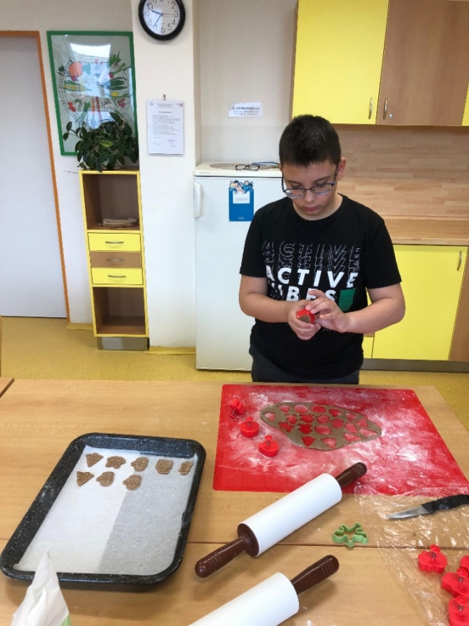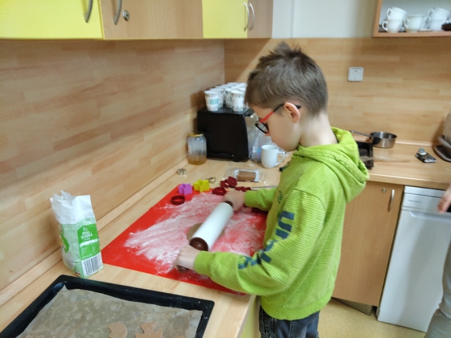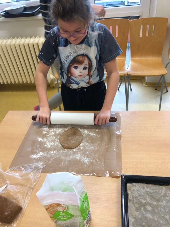 Dnes jsme se s žáky 4. třídy a ZŠS V. zapojili do pečení perníčků ve školní kuchyňce. Pro žáky bylo připravené perníkové těsto, se kterým dále samostatně nebo s dopomocí pracovali. Nejprve si žáci připravili pracovní plochu, těsto rozváleli a pomocí vykrajovátek vykrajovali různé tvary perníčků. Někteří žáci potřebovali při práci vedení, jiní zvládali jednotlivé kroky samostatně. Hotové perníčky žáci ukládali na plech vyložený pečicím papírem. Společně jsme perníčky vložili do trouby a po upečení je nechali vychladnout. Aktivita rozvíjela jemnou motoriku, samostatnost, spolupráci a dodržování pracovního postupu. Pečení probíhalo v příjemné a klidné atmosféře a žáci měli z výsledku své práce radost.