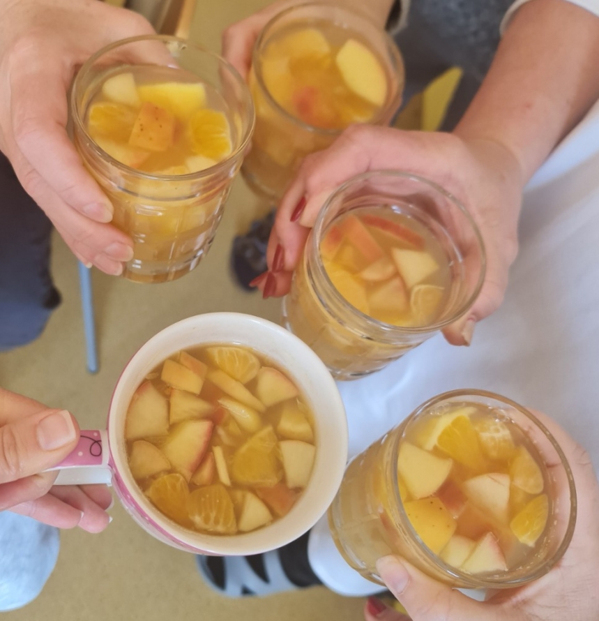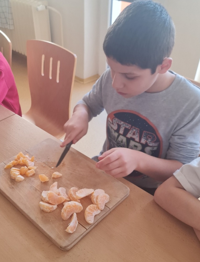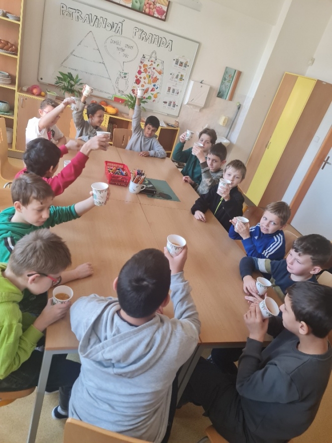 Dnes proběhla se žáky 1. stupně naší školy příprava vánočního punče. Aktivita byla zaměřena na společnou práci, vánoční atmosféru a rozvoj praktických dovedností. Potřebné ingredience jsme získali v rámci projektu Ovoce do škol. Ve školní kuchyňce jsme si nejprve připravili veškeré ovoce, které jsme obdrželi. K dispozici jsme měli pomeranče, jablka, hrušky, mandarinky, citrony a jablečné džusy. Žáci se postupně zapojili do práce a pod dohledem dospělých ovoce krájeli. Při práci dbali na bezpečnost a vzájemnou spolupráci. Nakrájené ovoce jsme vložili do nádoby a dali ohřívat. Za občasného míchání jsme přidali perníkové koření a celou skořici. Kuchyňkou se brzy rozvoněla příjemná vánoční vůně. Hotový punč jsme žákům nalévali do kelímků. Děti měly radost, že mohly ochutnat nápoj, na jehož přípravě se samy podílely. Během čekání na punč si žáci vybarvovali předem připravené vánoční omalovánky. Celá aktivita probíhala v klidné a přátelské atmosféře. Společná příprava vánočního punče byla pro žáky příjemným zpestřením adventního času.