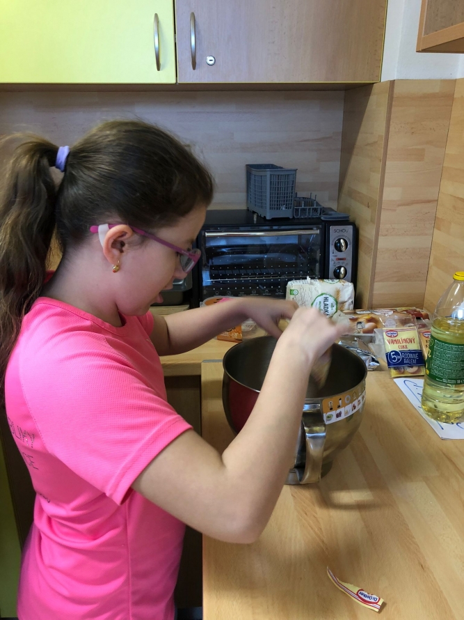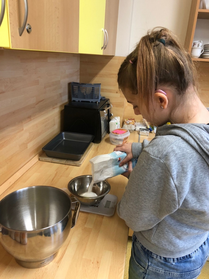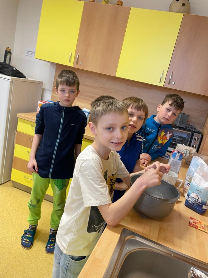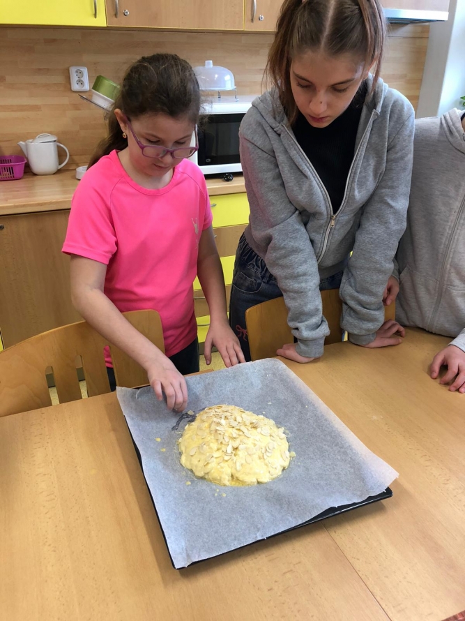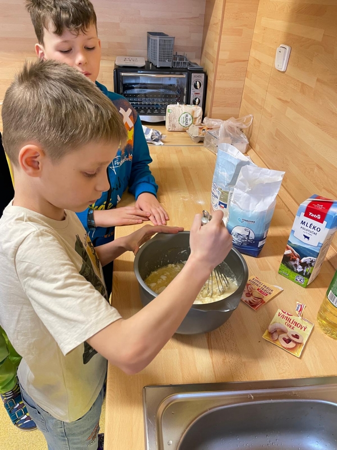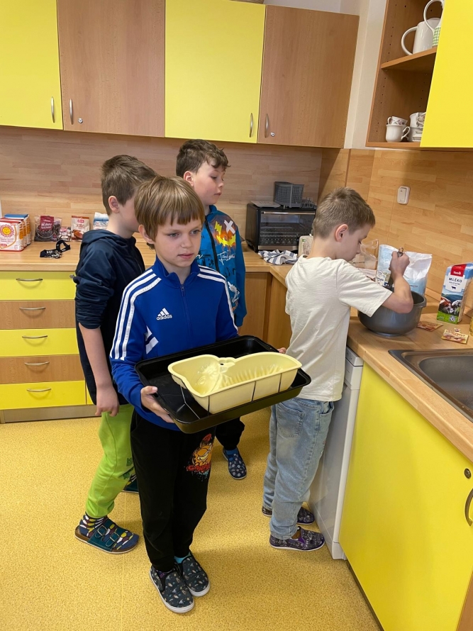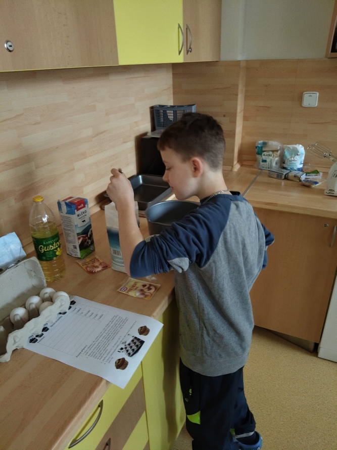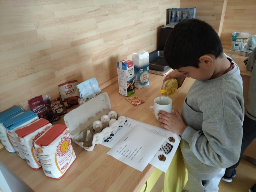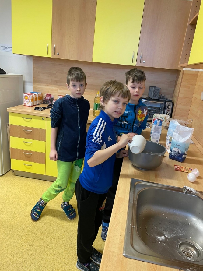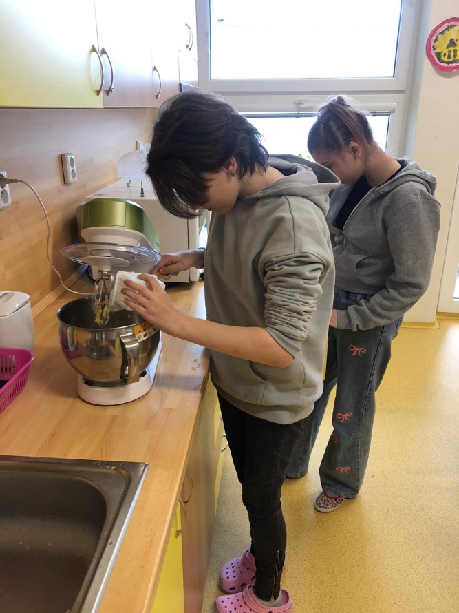 1., 2. a 3. třída pekla jako první velikonočního beránka. Pět žáků se postupně střídalo u jednotlivých činností, aby si každý mohl vyzkoušet různé kroky přípravy. Nejprve si společně připravili suroviny, které jeden z nich kontroloval podle receptu. Další žák vážil mouku a cukr, jiný rozklepával vejce a přidával je do mísy. Jeden žák míchal těsto, zatímco ostatní mu postupně podávali ingredience. Poté si vyzkoušeli vymazání a vysypání formy na beránka a společně do ní nalili hotové těsto. Během pečení uklízeli pracovní plochu a po upečení beránka ho opatrně vyklopili z formy. Nakonec ho ozdobili moučkovým cukrem. Třída ZŠS V. pekla velikonoční mazanec sypaný mandlemi, tentokrát z těsta s kypřícím práškem. Také zde bylo pět žáků, kteří se aktivně zapojovali do všech činností. Jeden žák odměřoval mouku, další přidával cukr a kypřící prášek do pečiva. Jiný žák rozklepával vejce a připravoval tvaroh a změklé máslo. Jeden žák směs míchal, zatímco ostatní postupně přidávali jednotlivé ingredience. Po vytvoření hladkého těsta ho společně přenesli na plech s pečicím papírem a vytvarovali bochánek. Následně mazanec potřeli rozšlehaným vejcem a posypali plátky mandlí. Během pečení uklízeli pracovní plochu a po upečení mazanec společně zhodnotili. Jako poslední pekla 4. třída muffiny s čokoládovými kousky zdobené čokoládovými kraslicemi. Pět žáků se zapojilo do práce a každý měl svou roli, kterou si postupně měnili. Někteří žáci vážili a odměřovali ingredience, jiní zapisovali recept a jednotlivé kroky přípravy. Jeden žák míchal suché suroviny, další přidával tekuté ingredience a společně vytvořili hladké těsto. Následně do něj vmíchali čokoládové kousky. Jeden žák plnil formičky na muffiny, další kontroloval jejich rovnoměrné naplnění. Po upečení nechali muffiny vychladnout a poté je zdobili čokoládovými kraslicemi. Na závěr všichni společně uklidili pracovní místo a zhodnotili svou práci.