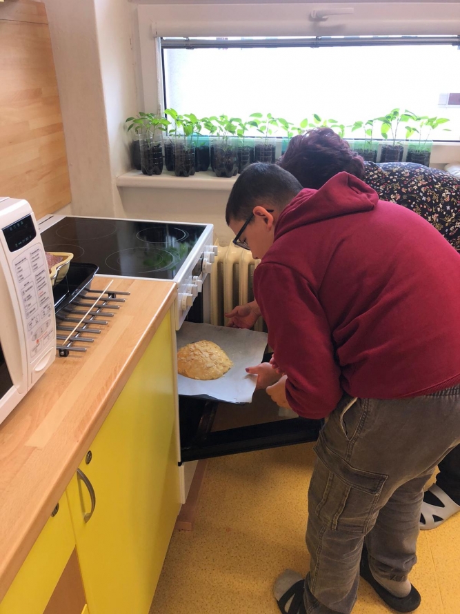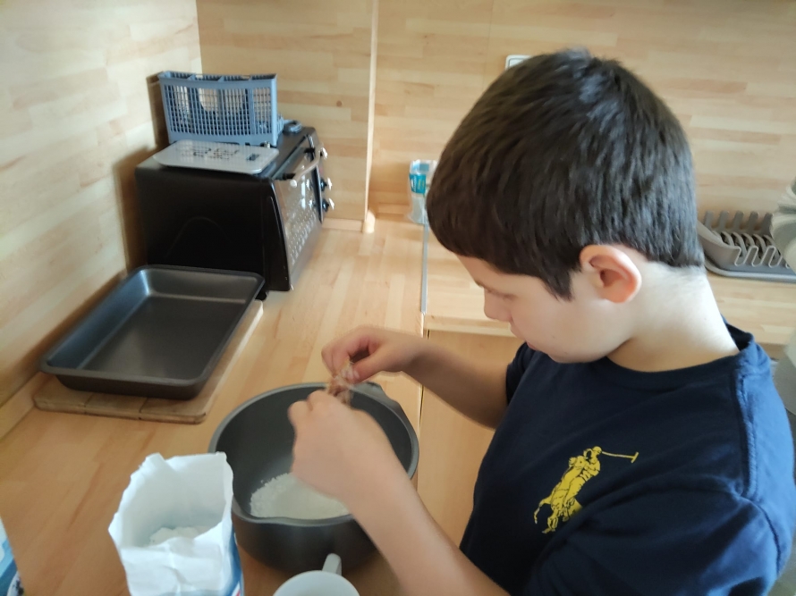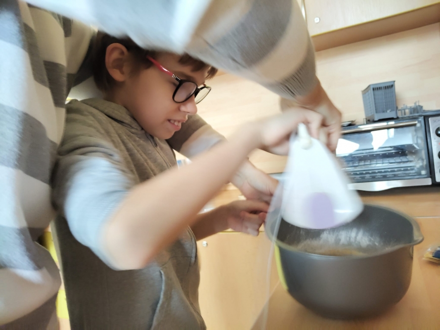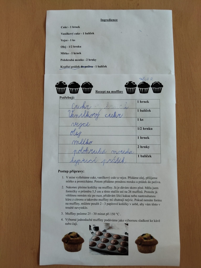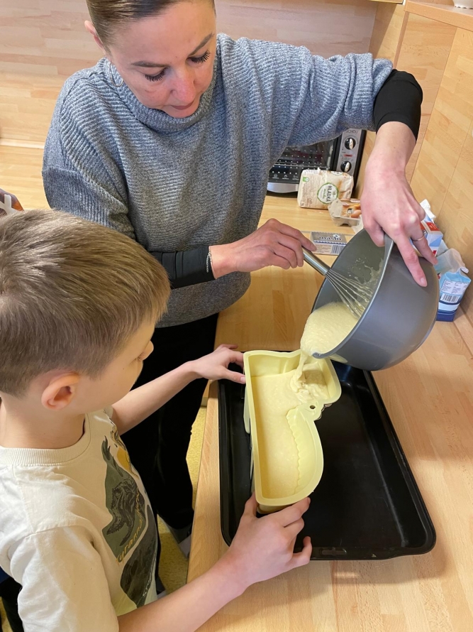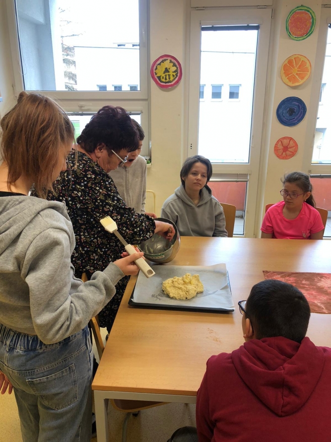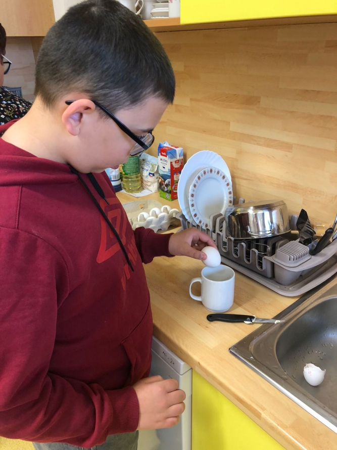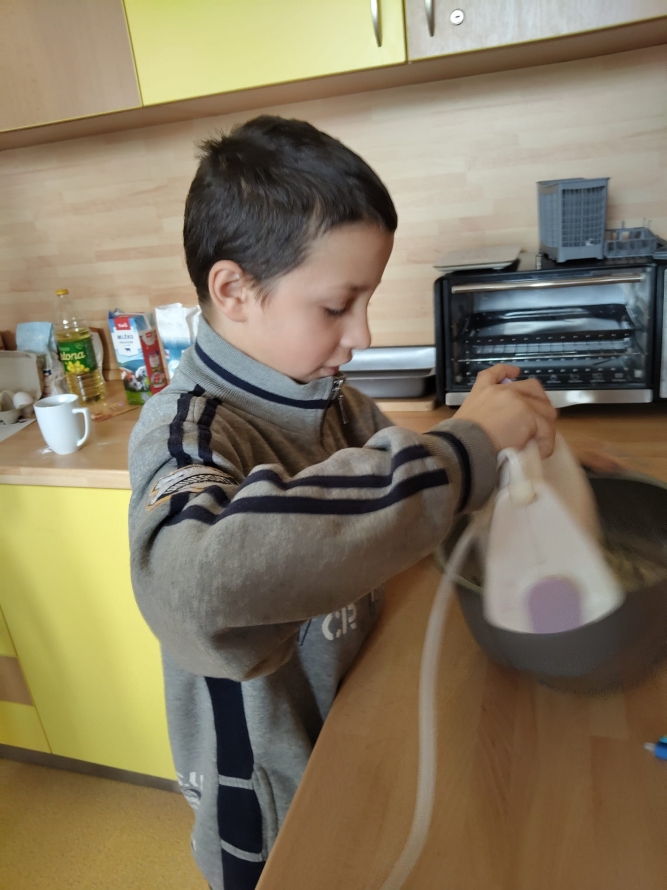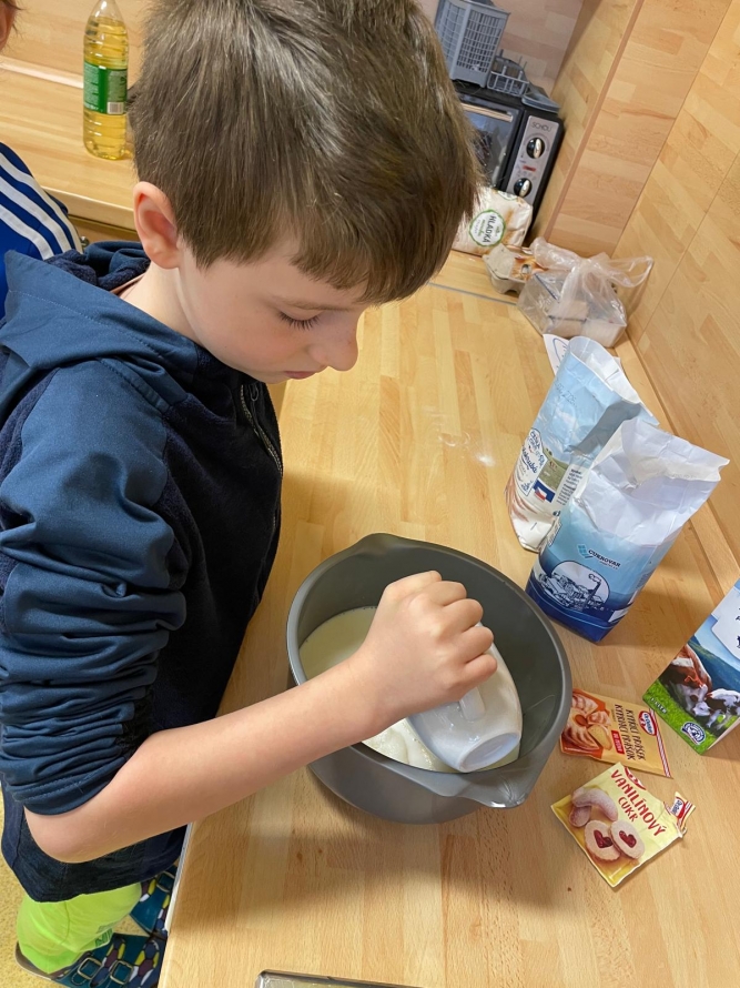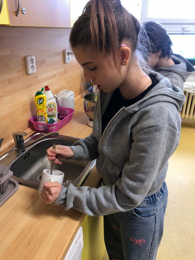 1., 2. a 3. třída pekla jako první velikonočního beránka. Pět žáků se postupně střídalo u jednotlivých činností, aby si každý mohl vyzkoušet různé kroky přípravy. Nejprve si společně připravili suroviny, které jeden z nich kontroloval podle receptu. Další žák vážil mouku a cukr, jiný rozklepával vejce a přidával je do mísy. Jeden žák míchal těsto, zatímco ostatní mu postupně podávali ingredience. Poté si vyzkoušeli vymazání a vysypání formy na beránka a společně do ní nalili hotové těsto. Během pečení uklízeli pracovní plochu a po upečení beránka ho opatrně vyklopili z formy. Nakonec ho ozdobili moučkovým cukrem. Třída ZŠS V. pekla velikonoční mazanec sypaný mandlemi, tentokrát z těsta s kypřícím práškem. Také zde bylo pět žáků, kteří se aktivně zapojovali do všech činností. Jeden žák odměřoval mouku, další přidával cukr a kypřící prášek do pečiva. Jiný žák rozklepával vejce a připravoval tvaroh a změklé máslo. Jeden žák směs míchal, zatímco ostatní postupně přidávali jednotlivé ingredience. Po vytvoření hladkého těsta ho společně přenesli na plech s pečicím papírem a vytvarovali bochánek. Následně mazanec potřeli rozšlehaným vejcem a posypali plátky mandlí. Během pečení uklízeli pracovní plochu a po upečení mazanec společně zhodnotili. Jako poslední pekla 4. třída muffiny s čokoládovými kousky zdobené čokoládovými kraslicemi. Pět žáků se zapojilo do práce a každý měl svou roli, kterou si postupně měnili. Někteří žáci vážili a odměřovali ingredience, jiní zapisovali recept a jednotlivé kroky přípravy. Jeden žák míchal suché suroviny, další přidával tekuté ingredience a společně vytvořili hladké těsto. Následně do něj vmíchali čokoládové kousky. Jeden žák plnil formičky na muffiny, další kontroloval jejich rovnoměrné naplnění. Po upečení nechali muffiny vychladnout a poté je zdobili čokoládovými kraslicemi. Na závěr všichni společně uklidili pracovní místo a zhodnotili svou práci.